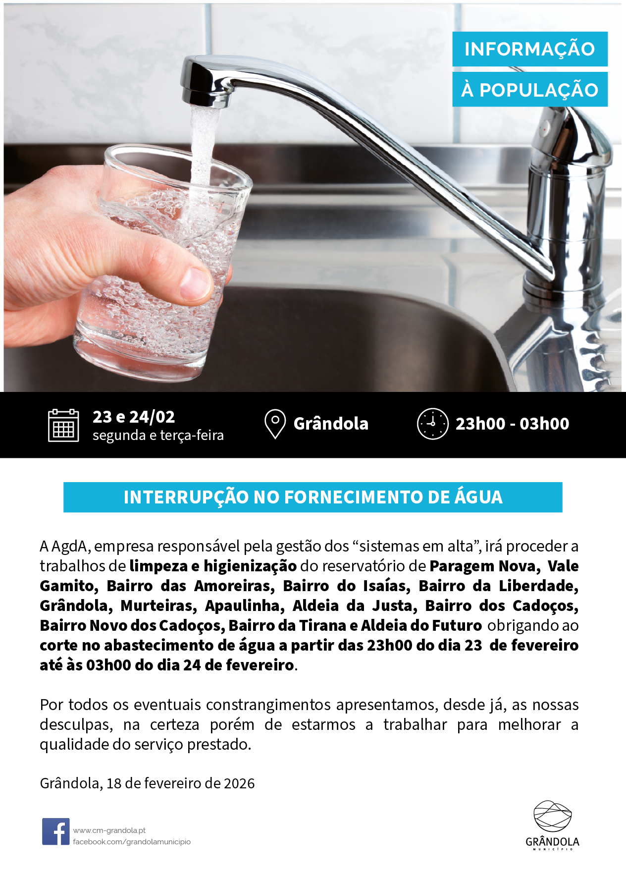 - Informação à População - Interrupção do abastecimento de água - 23 e 24 fevereiro - Grândola